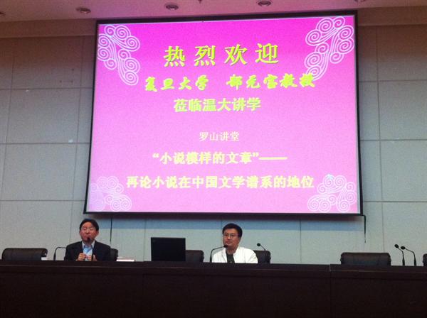 育英图书馆拉开盛幕,本次讲堂的主题为“小说模样的文章——论小说在中国文学谱系中的地位”。主讲为来自复旦大学的郜元宝教授。出席人员有学院党总支书记吴静、副院长孙良好、青年作家马小予、崔勇和陈小碧博士。