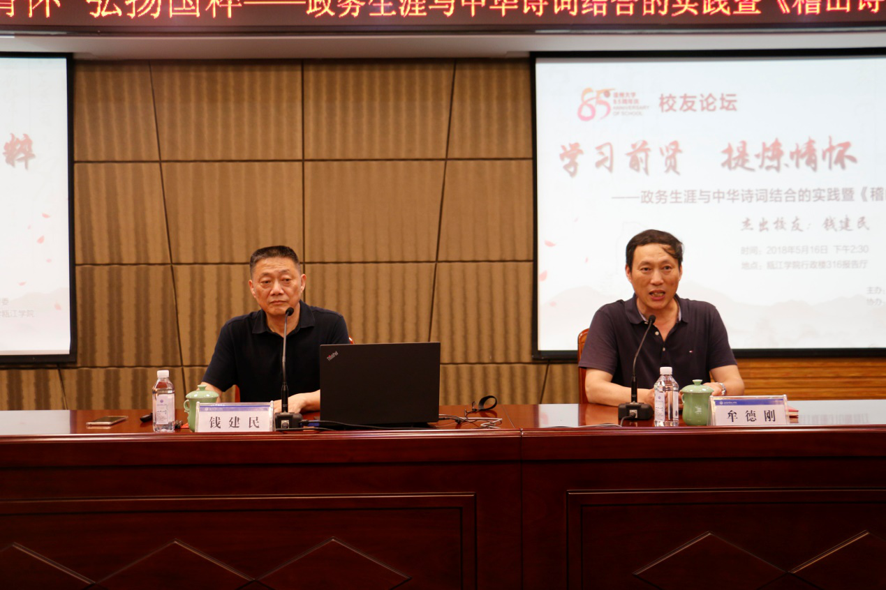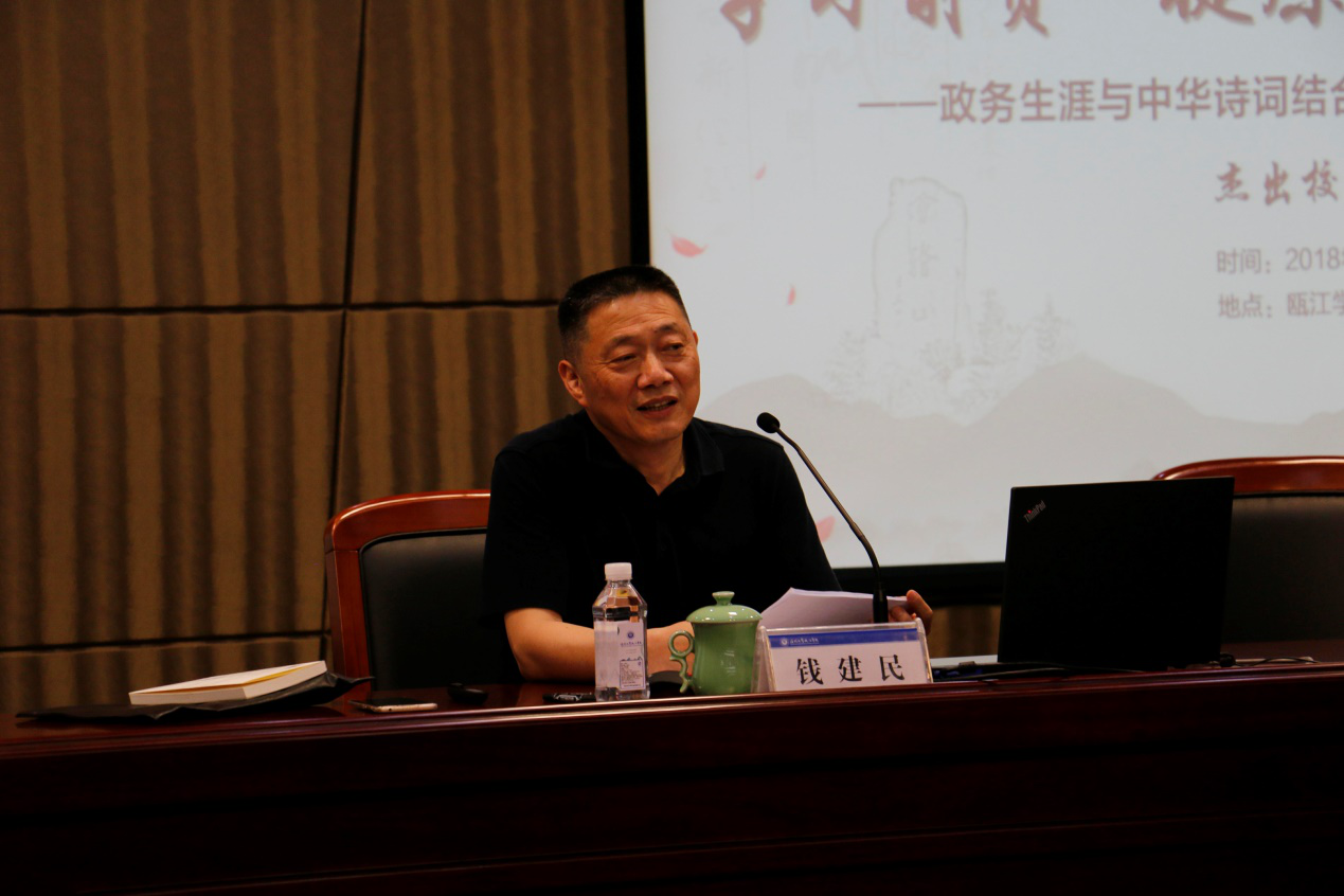 孔子云:诗三百,一言以蔽之,曰思无邪。2018年5月16日14:30,政务生涯与中华诗词结合的实践暨《稽山诗草》介绍学术讲座于我校瓯江学院行政楼316会议室如期举行。主讲人为浙江省人大常委会专职委员、第十二届全国人大代表,同时也是樱花小说 优秀校友钱建民先生。讲座由樱花小说 党委副书记牟德刚主持。