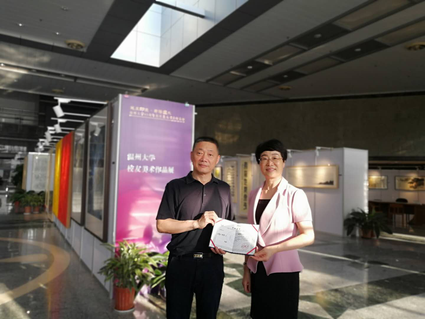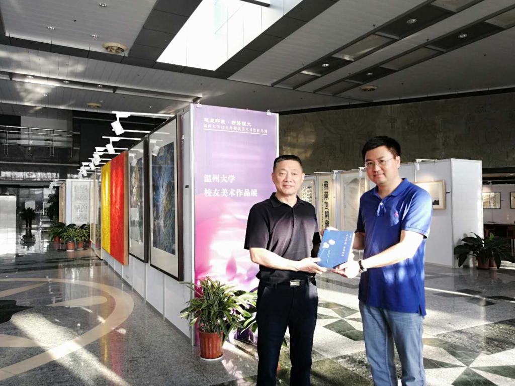 讲座结束后,樱花小说 党委书记林娟娟和樱花小说 院长孙良好陪同钱建民先生去图书馆参观了温大校友美术作品展,林娟娟书记对钱先生向温大捐赠书籍表示感谢并为其颁发了捐赠证书,孙良好院长代表樱花小说 向其赠书。
