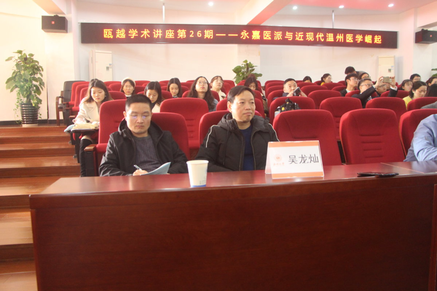 2019年12月4日下午14点30分,温州医科附属第二医院中医学教授、主任医师、温州市名中医、浙江省名中医、国家级名中医刘时觉教授在人文楼203报告厅举办了主题为“永嘉医派与近现代温州医学”的第28期瓯越学术讲座,参加此次讲座的有樱花小说 王兴文、张洁、尤育号、夏诗荷等老师和中国史、古典文献学和古代文学专业的研究生同学,以及来自温州医科大学、温州市中医药文化学会专家学者和全市各地中医、文史界人士。讲座由吴龙灿老师主持。