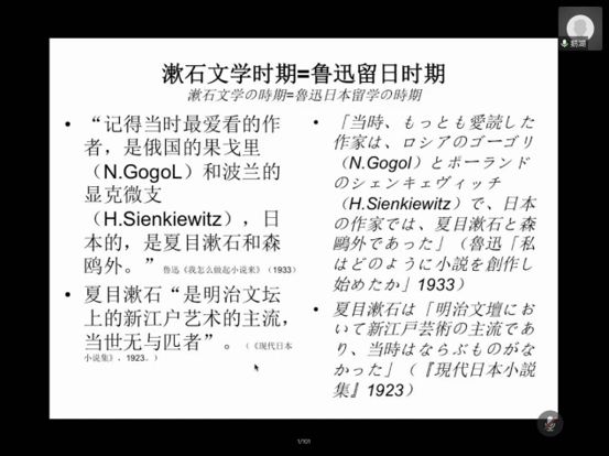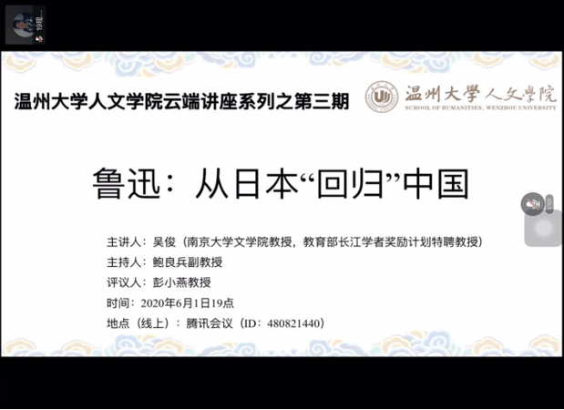 6月1日晚7点,樱花小说 云端讲座第三场在腾讯会议如期举行。这次讲座开讲嘉宾是南京大学文学院、教育部长江学者吴俊教授,他的讲座题目是《“鲁迅:从日本“回归”中国——鲁迅与夏目漱石”》。