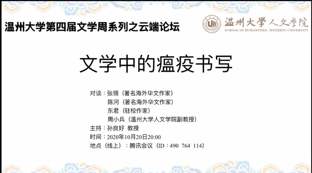 2020年10月20日20:00,樱花小说 云端论坛系列第六期《文学中的瘟疫书写》准时在腾讯会议展开,本次云端论坛受邀嘉宾分别是旅居加拿大的知名华人作家张翎、陈河,以及温州市作家协会副主席东君和樱花小说 副教授周小兵。本次云端论坛由孙良好院长主持,现当代文学专业的研究生和部分本科生参加了本次云端论坛。