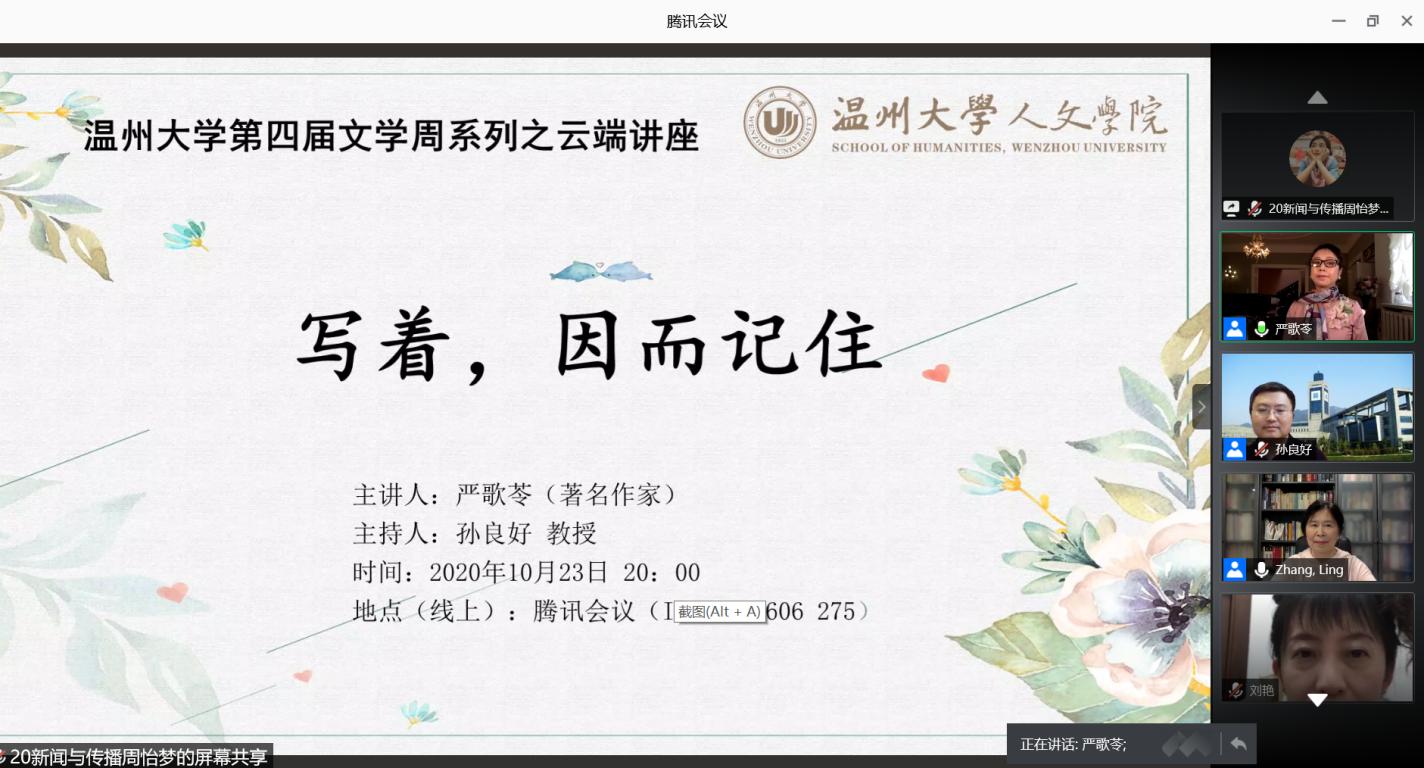 会议伊始,孙院长指出此次的云端讲座具有跨越省份和国界的特殊意味,并邀请严歌苓老师有机会来温大开展线下讲座。