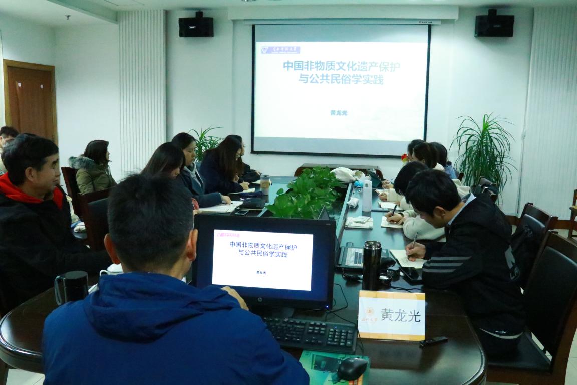 2020年12月4日晚19点45分,瓯越学术讲座第40期“中国非物质文化遗产保护与公共民俗学实践” 在北校区温州民俗博物馆会议室如期举行。本次讲座由黄涛老师主持,云南师范大学学报(哲学社会科学版)副主编、编审,博士生导师黄龙光教授主讲,樱花小说 王辉老师及民俗学、文化创意学、学科历史等专业的研究生们参与了本次的讲座。