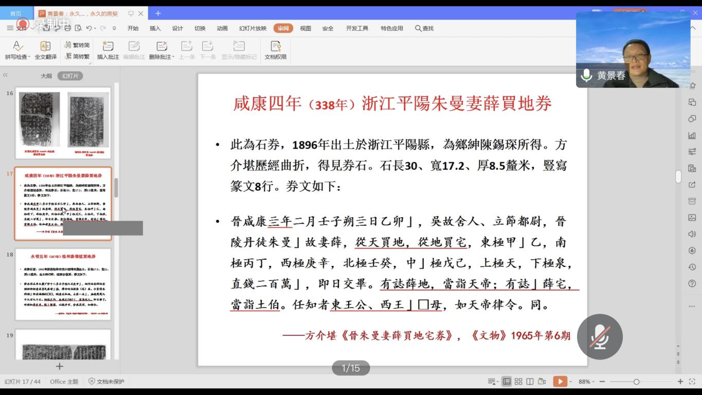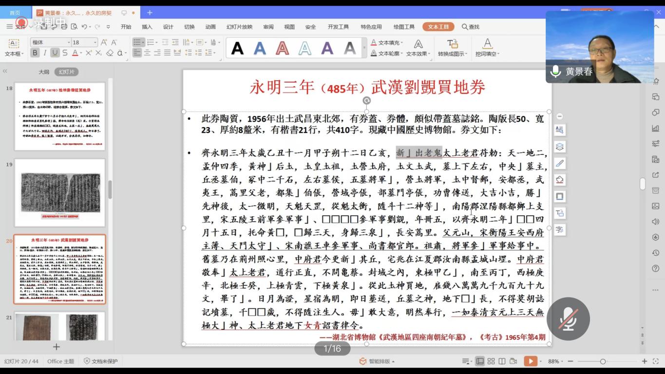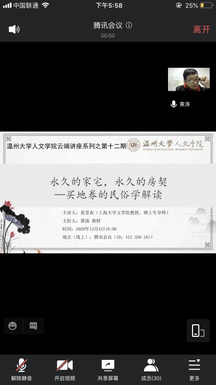 2020年12月4日晚,上海大学黄景春教授受邀于线上为樱花小说 师生作了题为“永远的家宅,永远的房契——买地券的民俗学解读” 的学术讲座,此次讲座由樱花小说 黄涛教授主持,万军老师、王辉老师出席,民俗学等专业研究生积极参与。