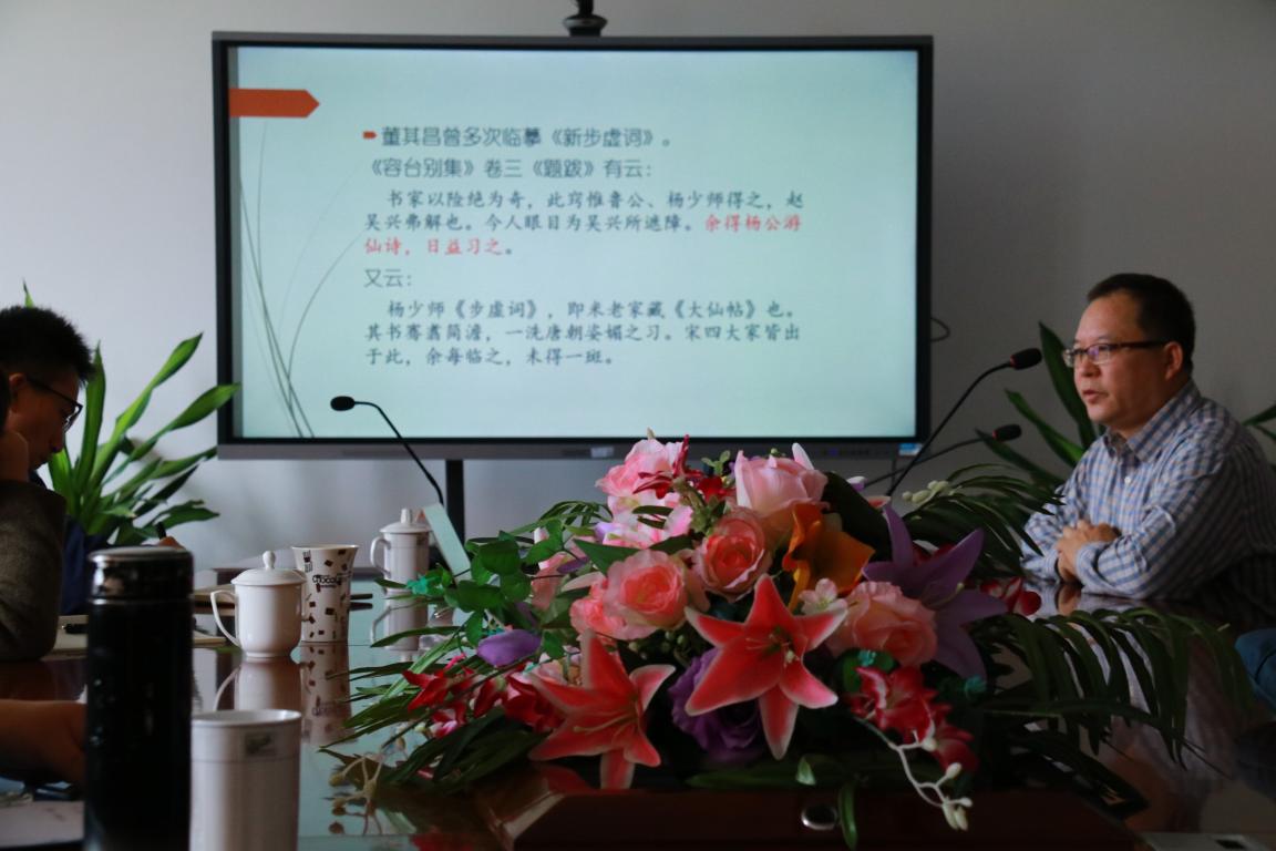 讲座伊始,杨万里教授介绍了罗争鸣教授,指出这次的讲座是一次专题学术讲座,在座师生以热烈的掌声欢迎罗争鸣教授发表报告。罗教授本次的讲座通过考证杨凝式刻帖《新步虚词》与韦渠牟原作,为在座师生演示其文献学的治学方法,与在座师生分享并讨论了研究心得。