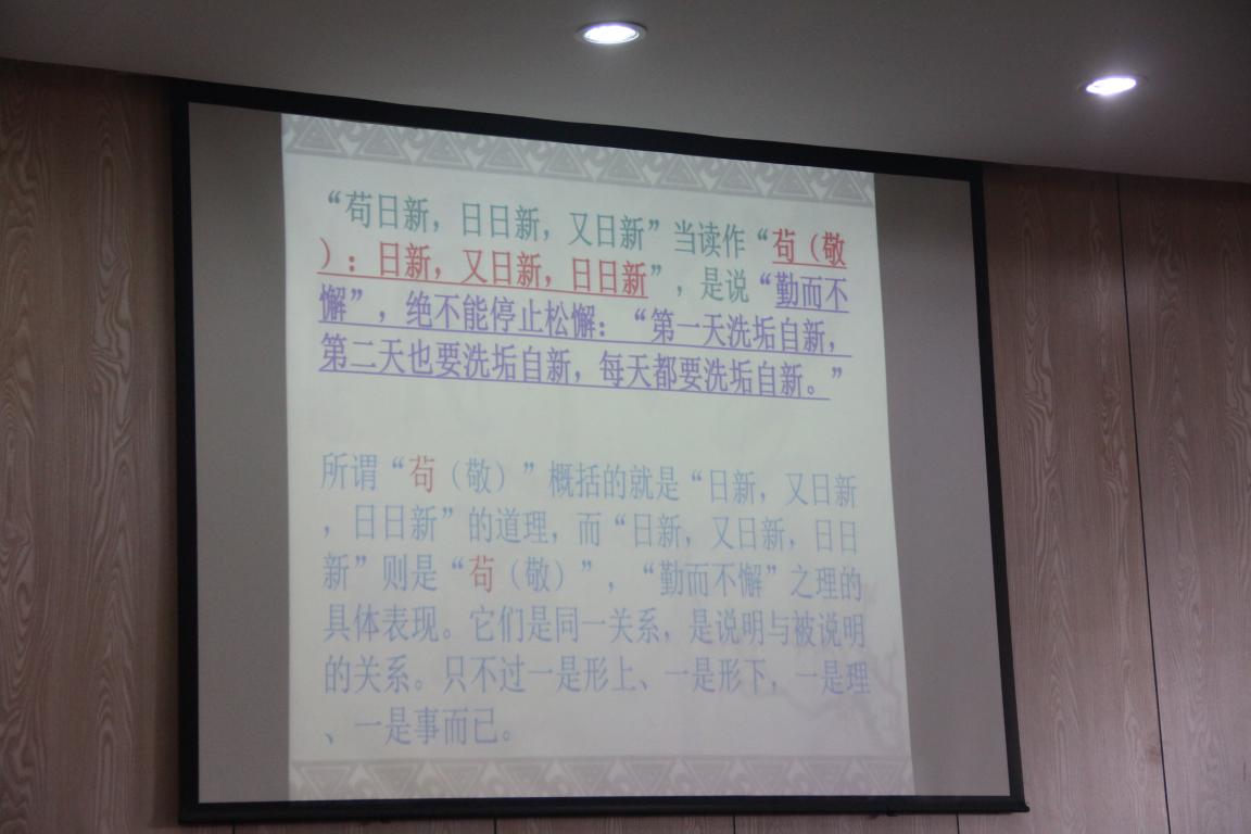 讲座伊始,廖教授首先从《礼记·大学》中经常可见的名句入手,引出《礼记·大学》篇,接着是论述郑玄、朱熹等对“大学”的释名,使同学们对“大学”有了深刻的了解;之后分别对《礼记·大学》篇中“苟日新,日日新,又日新”、“无所不用其极”进行了考释,通过解读大量史料,从而阐释自己的新观点,理清我们过去错误的观点,并将理论知识进行升华,劝诫温大学子做学问切记不可“三天打鱼,两天晒网”,要做到“日日新”。廖名春教授学识渊博,功力深厚,条理清晰,逻辑连贯,具有深刻的启发性。