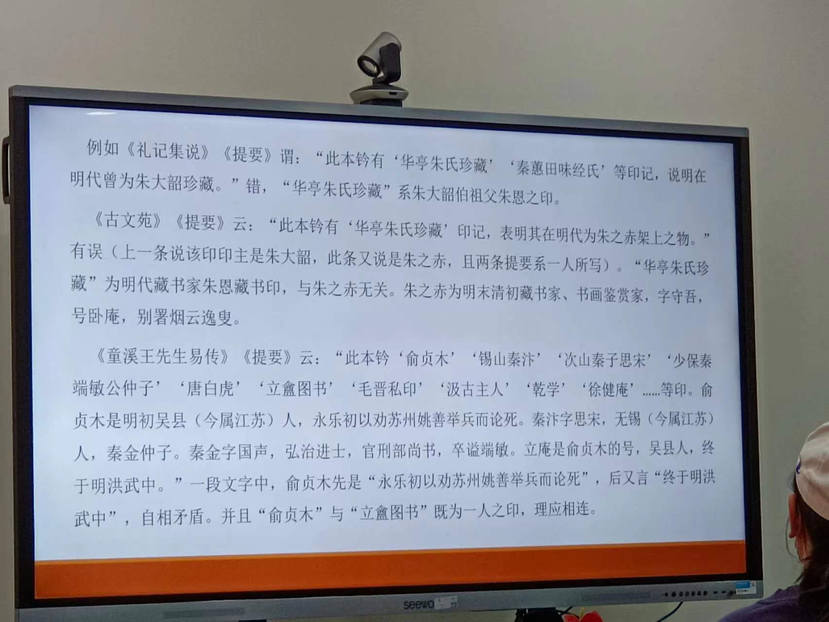 徐先生分享了关于版本学与校勘学、目录学的关系。校勘学方面,徐先生列举了如宋刻配清吕氏吾研斋抄本《王黄州小畜集》等大量文献鉴定的例子,又举了清代黄丕烈及近人傅增湘、张元济、周叔弢先生等文献学家,都花费大量时间校书,他们对古籍版本的鉴别和评价,都是建立在广泛、认真校勘基础上的。目录学方面,徐先生认为古籍目录由简到繁的发展,很大程度上就是为了适应版本鉴定的需求,早已超越了辨章学术、考镜源流的功能界限。徐先生指出,近几十年来学术界出现了版本学研究“空心化”现象,认为在学术研究和编辑出版、馆藏鉴定时,必须强调这三者之间的密切关系。