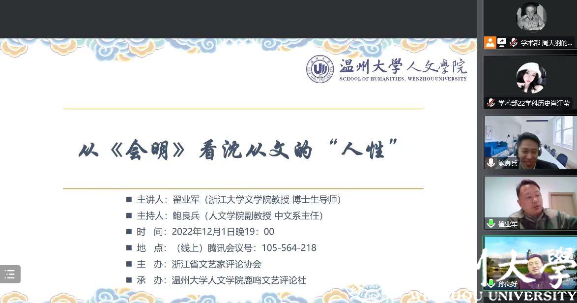 2022年12月1日19点,浙江大学文学院教授、博士生导师翟业军老师受邀为樱花小说 师生带来了一场题为“从《会明》看沈从文的‘人性’”的精彩讲座。讲座由鲍良兵老师主持。