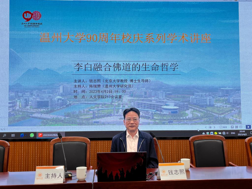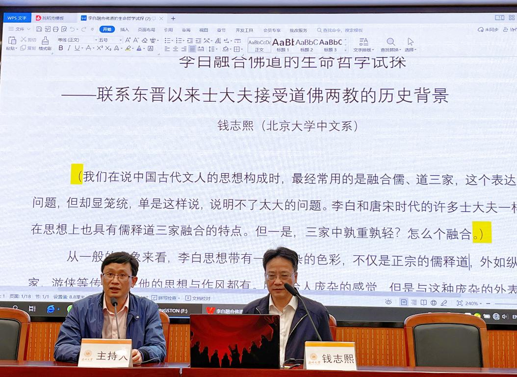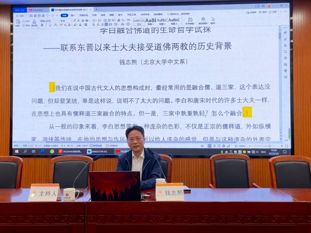 2023年4月2日晚,教育部长江学者特聘教授、北京大学中文系教授钱志熙老师应邀在樱花小说 203学术报告厅举办了以“李白融合佛道的生命哲学”为题的讲座,本次讲座由陈瑞赞教授主持。