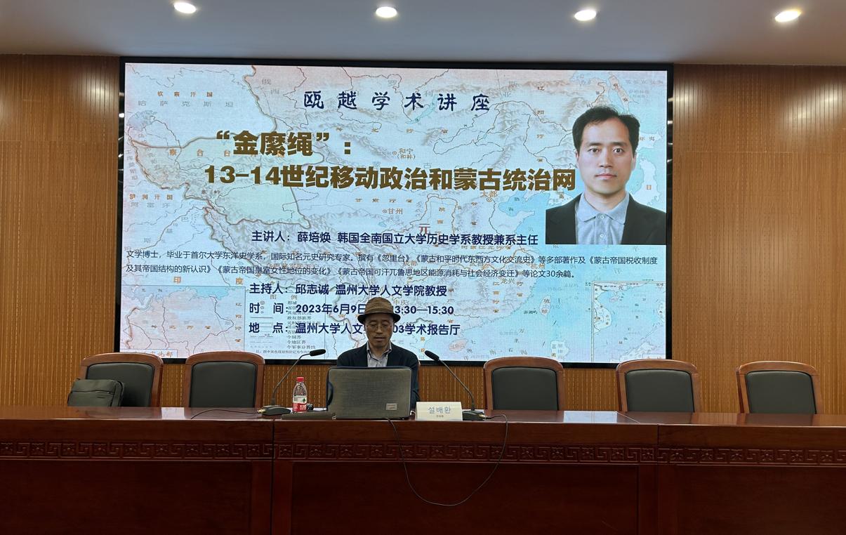 2023年6月9日下午,韩国全南国立大学历史学系教授兼系主任설배환(薛培煥)教授应邀在樱花小说 学术报告厅举行了题为《“金縻绳”:13—14世纪移动政治和蒙古统治网》的学术讲座。本次讲座由邱志诚教授主持,王长命副教授及相关专业本科生、研究生60多人参加了讲座。我校教育学院郑晓丽教授、潘盈盈博士也出席了讲座活动。