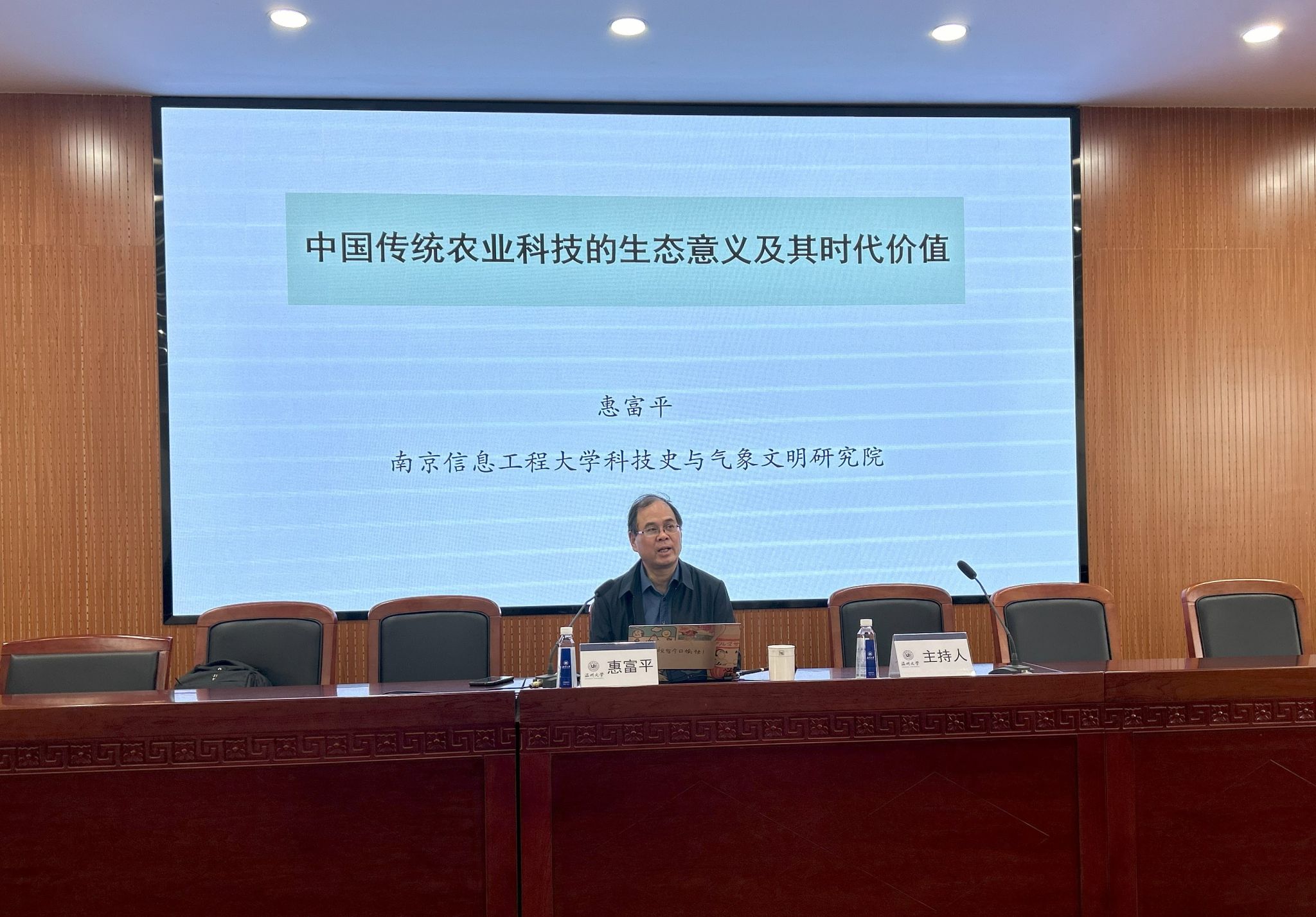 惠富平教授是著名农史专家,现任南京信息工程大学科技史与气象文明研究院院长、科学技术史博士学科点负责人。曾兼任中国农业历史学会副理事长、江苏省农史研究会会长等职务。惠教授著述宏富,已发表论文130余篇,出版《中国农书概说》《中国传统农业生态文化》《齐民要术解读》《中国古代粟作史》《人勤地利:明清太湖地区农业史》等专著10余部。惠富平教授在讲座中指出,传统农业与现代农业不是割裂的,中国传统农业实质上就是一种生态农业、有机农业,与现代生态农业是有内在联系的。传统农业科技中的积极因素非常多,包括农业三才论及阴阳五行学说、三宜生产原则与生态思想、用养结合的地力常新壮思想、相继相资的轮作复种制度、有机肥积制与利用、病虫害农业防治与生物防治、农业综合经营技术模式、万物并育与生物多样性保护、自然力利用等等。内容十分丰富,且形成了完整的科技文化体系,不仅对历史时期中国农业生产及社会发展产生了重大影响,还对当今农业发展具有示范和借鉴意义。