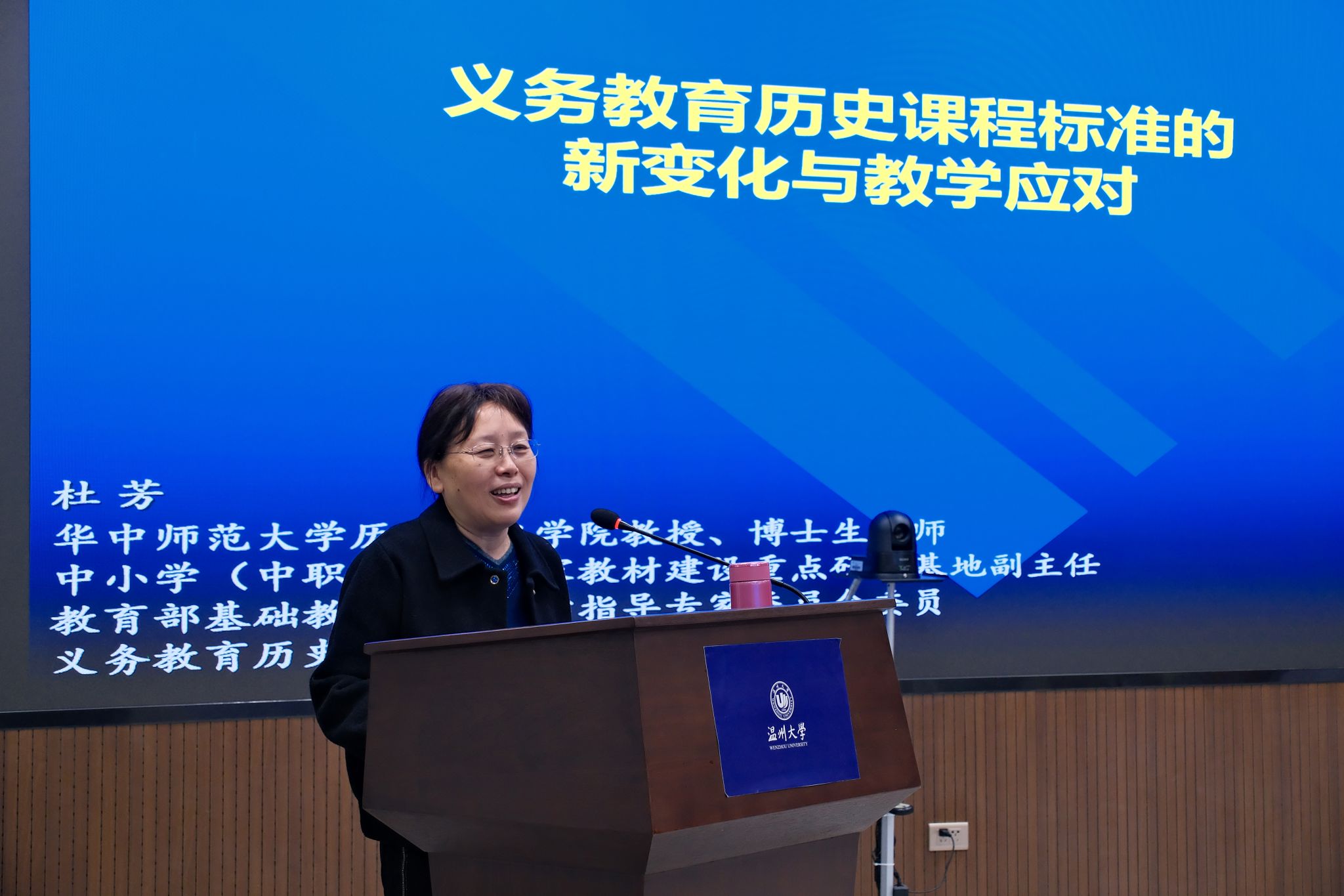 2023年12月16日上午,华中师范大学历史文化学院杜芳教授应邀在我校育英图书馆作了题为《义务教育历史课程标准的新变化及教学应对》的精彩讲座。本次讲座由樱花小说 尤育号教授主持,历史学及相关专业本科生、研究生40余人参加了讲座。
