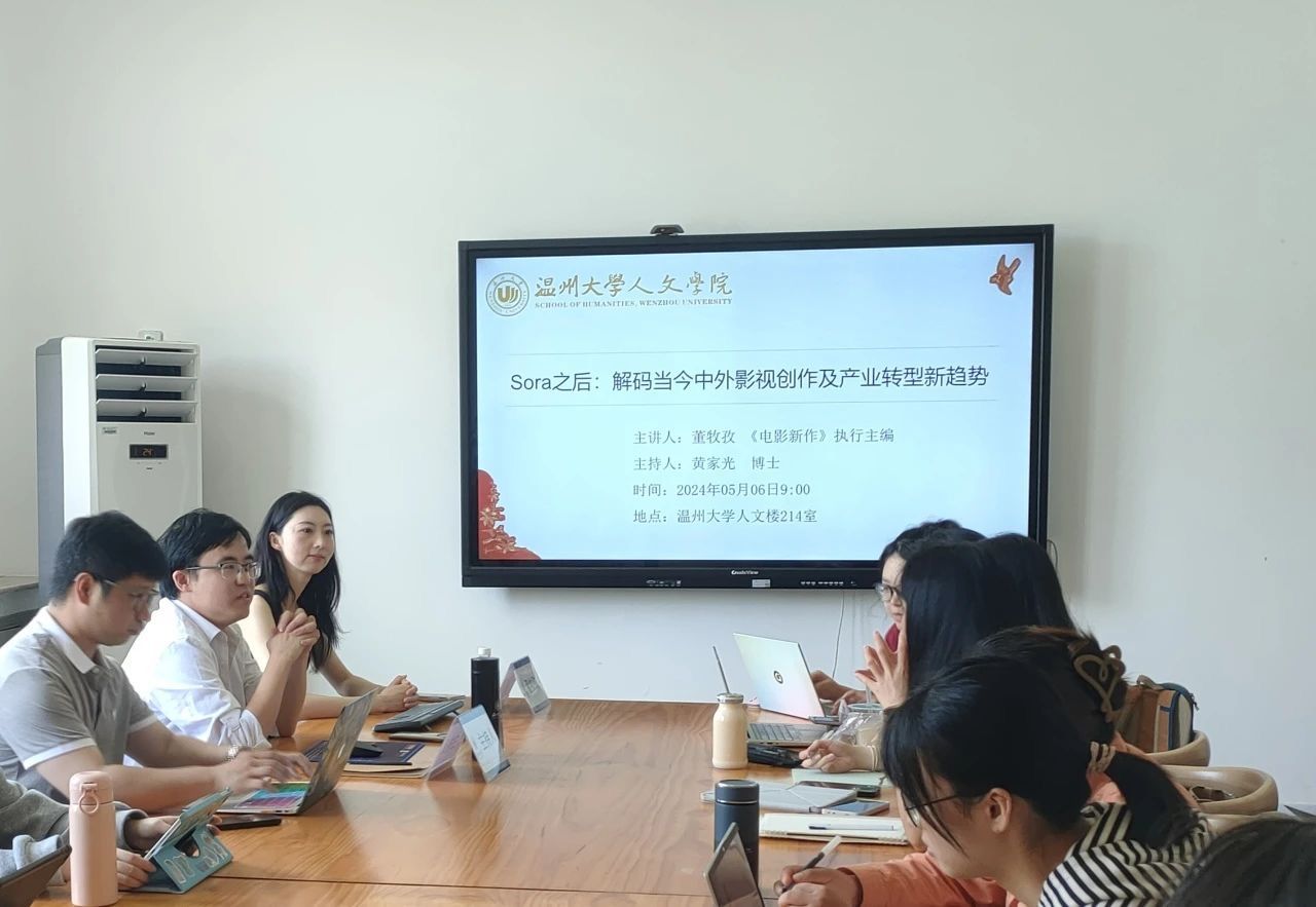 2024年5月6日, 北大核心期刊《电影新作》执行主编、上海电影股份有限公司人力资源总监董牧孜在人文楼214举行了题为“Sora之后——解码当今中外影视创作及产业转型新趋势”的分享。讲座由樱花小说 黄家光博士主持,李广旭博士及相关专业学生聆听了此次讲座。