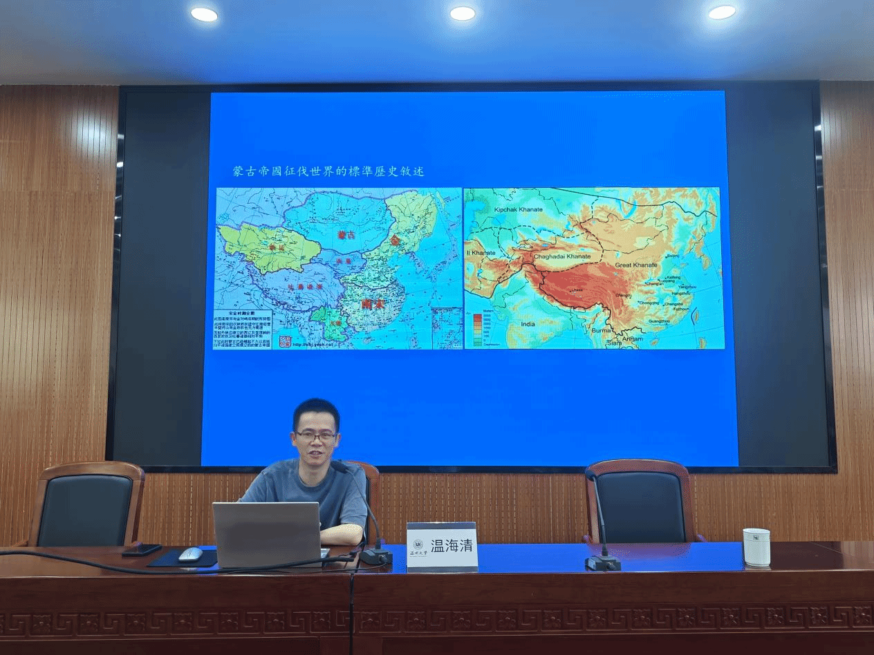 讲座伊始,刘莉老师对温教授的主要研究成果与学术贡献做简要介绍。接着温老师以其扎实的学术功底、通俗易懂的语言和独到的切入视角将师生们拉入到蒙元对外征伐的历史场景中,并循着“问题缘起”“西域杀使”“金杀北使”“南宋杀使毁书”等史实逻辑关系,逐步层层递进,为我们一一呈现出蒙元外交“遣使宣谕在前,武力相加于后”的一般故事。