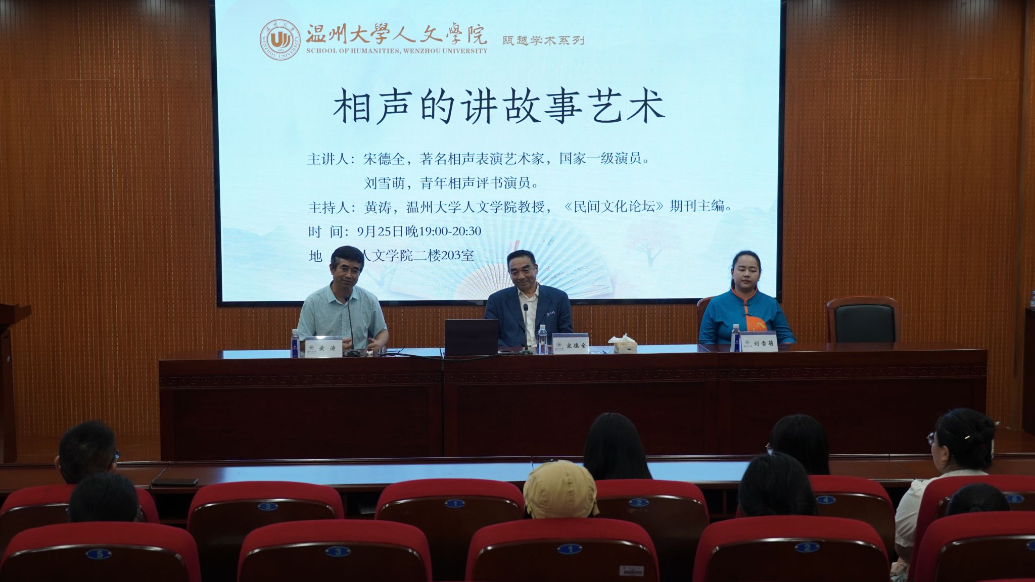 2024年9月25日晚,著名相声表演艺术家,国家一级演员,宋德全先生和青年相声评书演员刘雪萌女士,应樱花小说 、温州民俗博物馆邀请,在樱花小说 203学术报告厅,作了一场题为“相声的讲故事艺术”的学术讲座。本次讲座由黄涛教授主持,程安霞老师、王辉老师,温州市委党校胡正裕老师出席,樱花小说 各专业研究生、本科生积极参加。