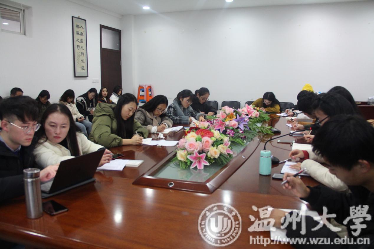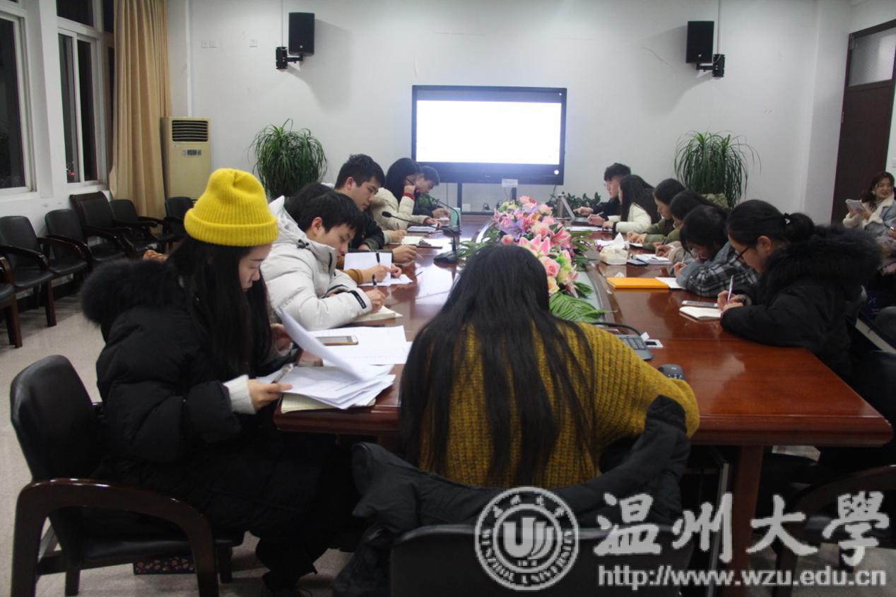 会议由研究生会主席郭佳乐主持,首先郭佳乐主席对本学期研会工作进行了简要总结,并对所有研会成员的工作给予肯定。接着,各部门部长就本学期的常规活动及其他特色活动进行了重点汇报。学术部本学期共开办讲座21场,打卡8次;申报科研创新项目26项,最终确立9项;科研业绩统计两次共3项;完成2017级学术型硕士的学术讲座审核、2016年度孵化项目检查结题、瓯越学术论坛结题;协助举办琦君高峰论坛以及第十二届文学周。除此之外,还举办了国奖与对外交流分享会、三期读书分享会和有奖征文大赛初期投稿等活动。宣传部本学期共撰写通讯46篇,微信推送58篇,其中单期阅读量最高的推送分别为:包饺子活动、18萌新攻略以及影视文化分享大赛决赛,阅读人数达到496、343、342人。微信推送的平均阅读量每月有5210次,阅读人数4332人等。纪检部部长就例会签到常规工作及包饺子活动进行了汇报。接着,办公室、生活部、文体部部长对本学期工作进行了总结,并简要介绍了下学期的工作规划和展望。不仅如此,各部门干事也畅谈了加入研会以来的所得所获。