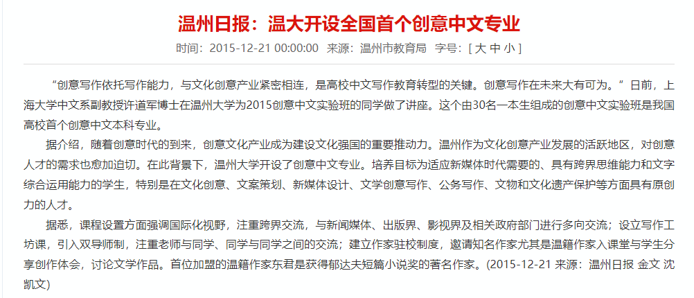 樱花小说 汉语言文学(创意中文实验班)系入选国家一流本科专业建设点的汉语言文学专业的方向之一,文脉可以追溯到晚清教育家孙怡让先生于1906年创办的温州师范学堂。2015年,樱花小说 汉语言文学专业创设创意中文实验班,成为国内最早进行中文创意写作教育教学和人才培养的高校之一。2016年建设驻校作家制度;2019年入选国家一流本科专业建设点;2021年成立温大创意写作研究中心,与上海大学、香港都会大学联合打造《中国创意写作研究》集刊的学术平台。拥有教育部国家语言文字推广基地、浙江省哲学社会科学重点A类研究基地“浙江传统戏曲研究与传承中心”等。专业以传统中文为基底,整合文史哲和文化创意资源,强化写作实践教学,致力于培养专业知识和人文素养“双优”、口头表达和书面写作“双高”、文学创作和文创生产“双强”的“三双”应用型高级人才。