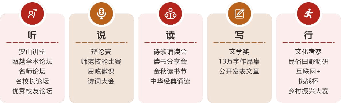 本专业实现中文、历史、广告等专业资源共享,罗山讲堂、瓯越学术讲座等提供前沿学术资源,国家语言文字推广基地等教研基地引导学生融入地方,“瓯语史”“《温州大典》研究编纂工程”等科研项目提供学生实践机会,打造“文学周”“百年语文”等七大校园文化品牌,“知语识文”国家通用语言文字推广等活动培养学生实战能力,已出版学生作品集《文字作坊》9辑、《文轩》16期、文学奖十周年作品选《拾年》等。借助温大创意写作研究中心、网络文创研究院等平台加强与地方联动,举办写作工坊、作家分享等学术活动组织学生参与专业发展,对接数创空间等文创市场组织学生参与行业发展,锻造学生的专业特质。将课堂搬进世界温州人家园、瓯海数创园等文创园区,开设剧本杀集训营等产业培训,邀请行业专家进实践课堂,推荐学生入企见习实习,助力学生成长成才。