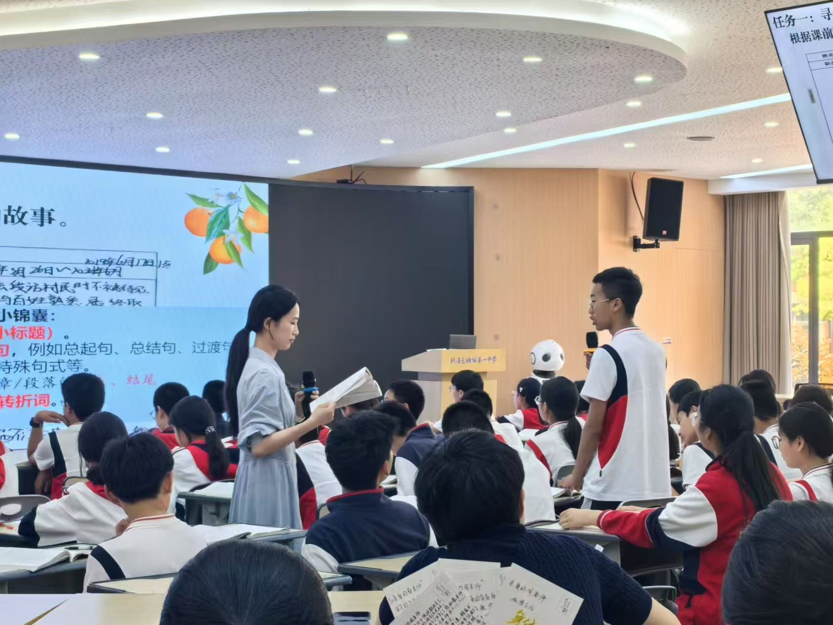 另一位实习生代表金晨蕊同学执教的《有为有不为》一课,则又呈现出别样的教学风貌。整堂课使用“新闻发布会”这一大情境,通过核心观点分享会、伦理听证会、提案磋商会三个环节将课堂串联起来,引导学生一同挖掘文本内涵与作者深意。整堂课内容丰富,既有着自己的思考,将一篇议论文展现得生动有趣,也加深了学生对文章的理解,激发了他们对伦理与文学的思考。