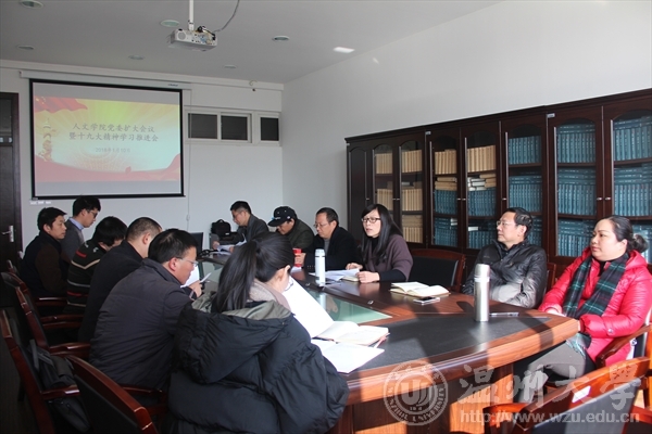 党委扩大会议暨十九大精神学习推进会在人文楼309会议室顺利召开,会议由学院党委书记吴静主持,学院党委委员及教工党支部书记参加会议。