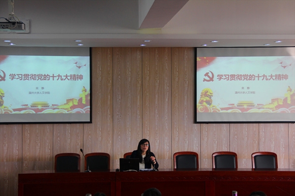 吴静书记的报告分为三个方面。她首先对十九大会议召开的背景、内容以及重要意义做了简要概述,然后从习近平总书记报告的总体框架结构、新概念新名词新理念以及报告的多重意义三个方面重点对报告做了详细解读,最后吴静书记还围绕报告中关于优先发展教育事业的论述,结合学校学院实际,对学院接下来如何聚焦学科建设、着力人才培养、寻求特色发展等问题提出了希望和要求。