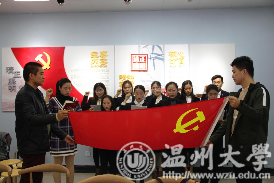 首先,9位发展对象各自从入党动机、学习、工作和生活等方面对自身进行综合评价,并宣读《入党志愿书》,表达其向党组织靠拢、对党忠诚的决心和行动;发展对象的入党介绍人赵飞跃、金梦宜、卓阿莹、李丽等正式党员对发展对象进行客观评价,指出其优点和不足,介绍其加入中国共产党;随后由党支部正式党员进行无记名投票,整个票决过程严肃透明,做到了公平公正。会上,9位发展对象顺利发展成为预备党员。在支部书记徐珍的带领下,9位新进预备党员面对党旗进行庄重的入党宣誓。