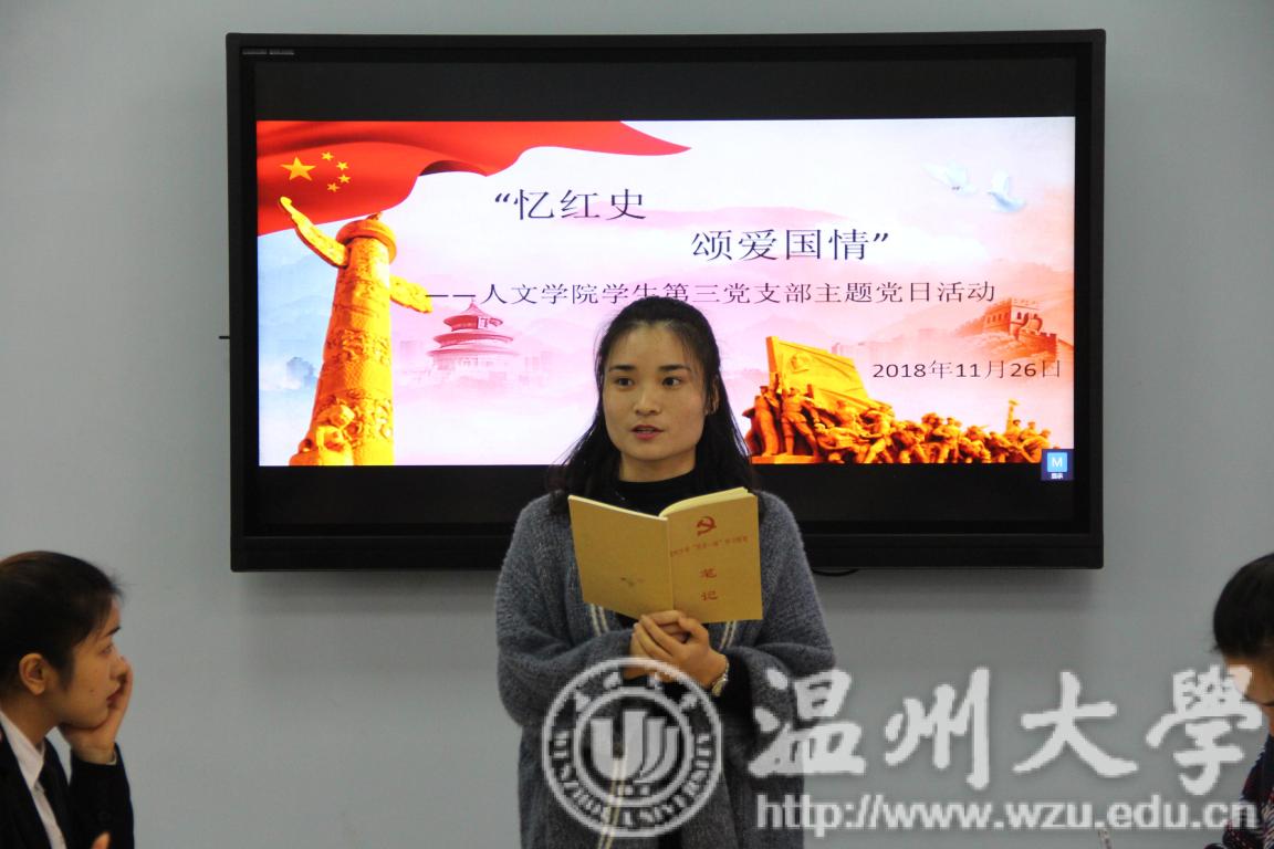 11月26日下午,樱花小说 学生第三党支部在外语楼党员之家221会议室成功召开了“忆红色革命史,颂爱国主义情”主题党日活动。本次党日活动由支部书记徐珍主持,学生第三党支部全体党员参加。