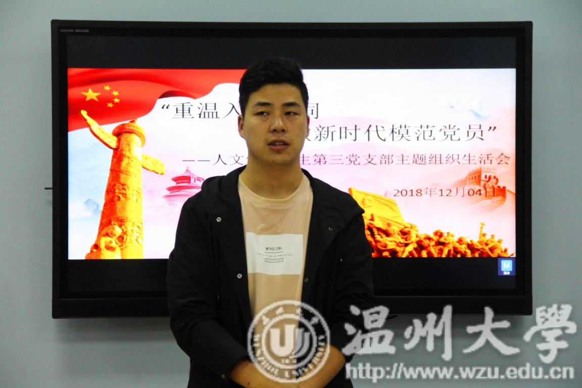 会议开始,各党小组代表分别就入党誓词和如何在新时代做一名模范党员分享自己的学习感悟。赵飞跃同志回顾了入党誓词的演变历程,认为不同时期的入党誓词有其不同的历史特色,但是永不叛党是每个时期每一位共产党员都应具备的最基本的要求。林望帆同志认为,古今楷模说明初心的重要性,新时代的合格党员要有“心”,有爱党敬业的心,有自省约束的心。自身端正,才能不忘为民服务的本心。谢凤娇同志结合将改革进行到底纪录片谈到,时代楷模具有以身示范性,体现了我党重百姓,从群众中来到群众中去的工作作风。每一位共产党员都应该有主人翁意识、参与意识。刘洋同志则认为,现在的入党誓词虽然只有短短的80字左右,但却涵盖了对每一个共产党员的基本要求,包括责任、使命、不忘初心。黄晓丽同志以故事入手,强调共产党员要遵守诺言,学生党员更应该重定位形象,无论将来从事什么行业,都不要忘记自己是一名共产党员。每位党员代表都从不同的方面谈到了入党誓词对一个党员的重要性,牢记入党誓词,将有助于我们成为新时代的模范党员。