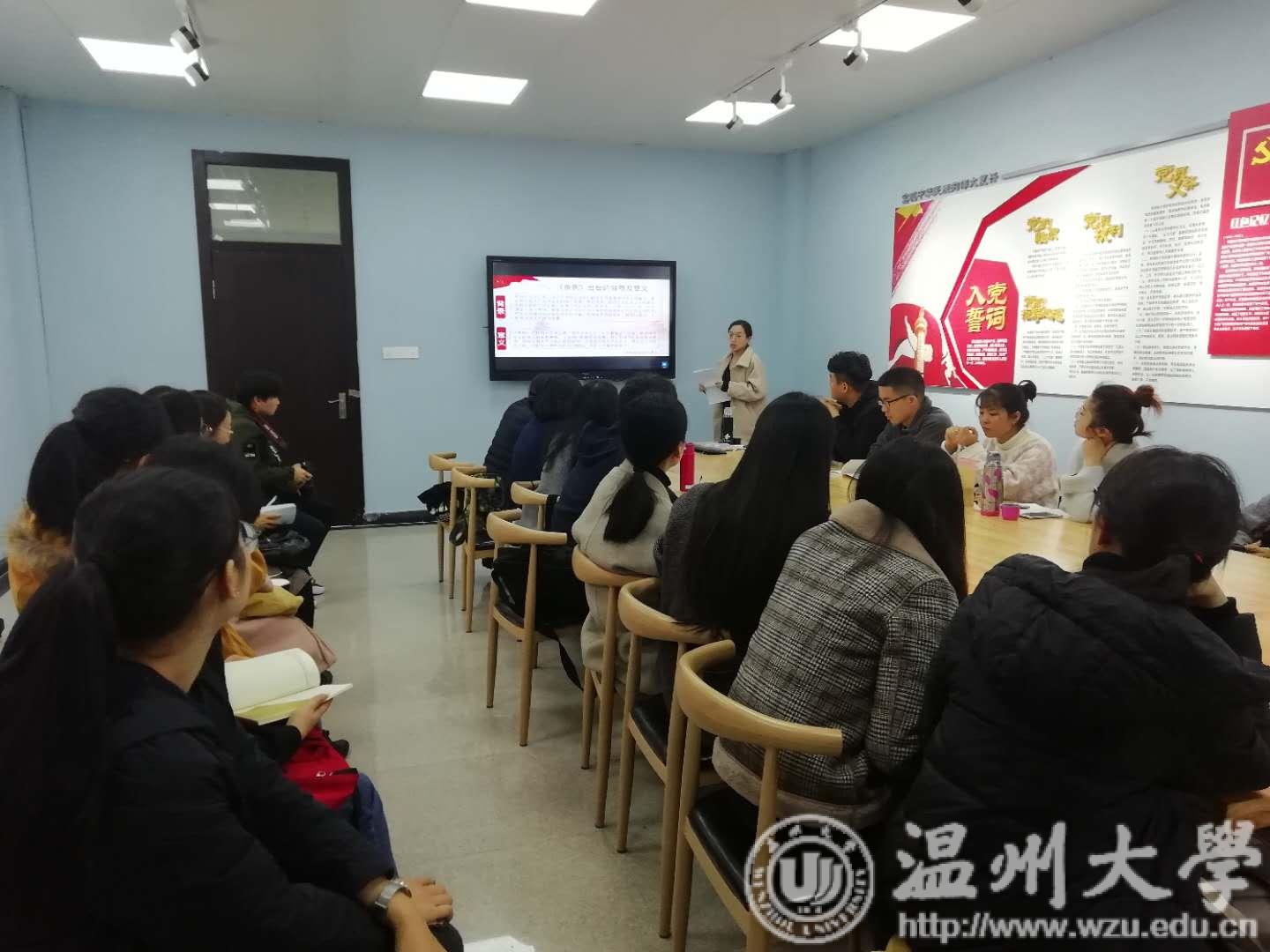 2018年12月23日下午,樱花小说 学生第二党支部举行“学习《中国共产党支部工作条例(试行)》”主题党日活动。本次主题党日活动以党课的形式开展,由支部书记陈赛君进行宣讲。