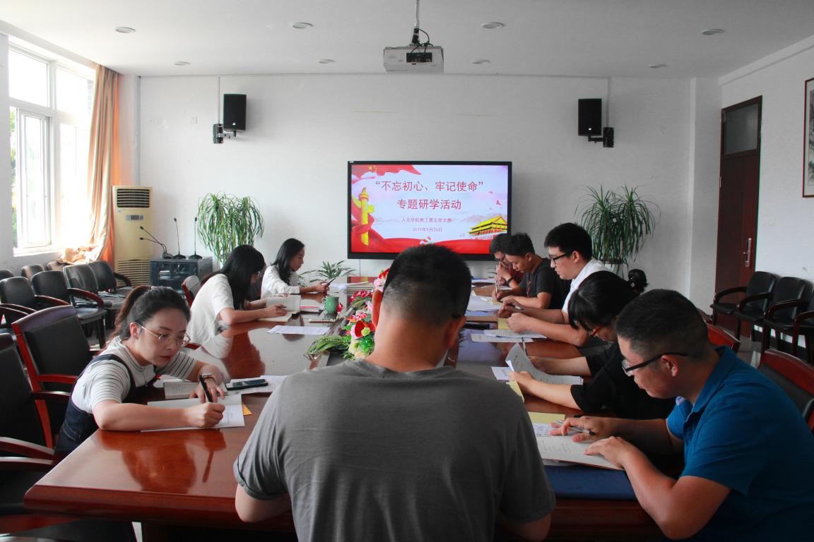 9月26日上午,樱花小说 教工第五党支部在北校人文楼213会议室召开了“不忘初心、牢记使命”专题研学活动。活动由党支部书记刘纪峰主持,支部成员参加。