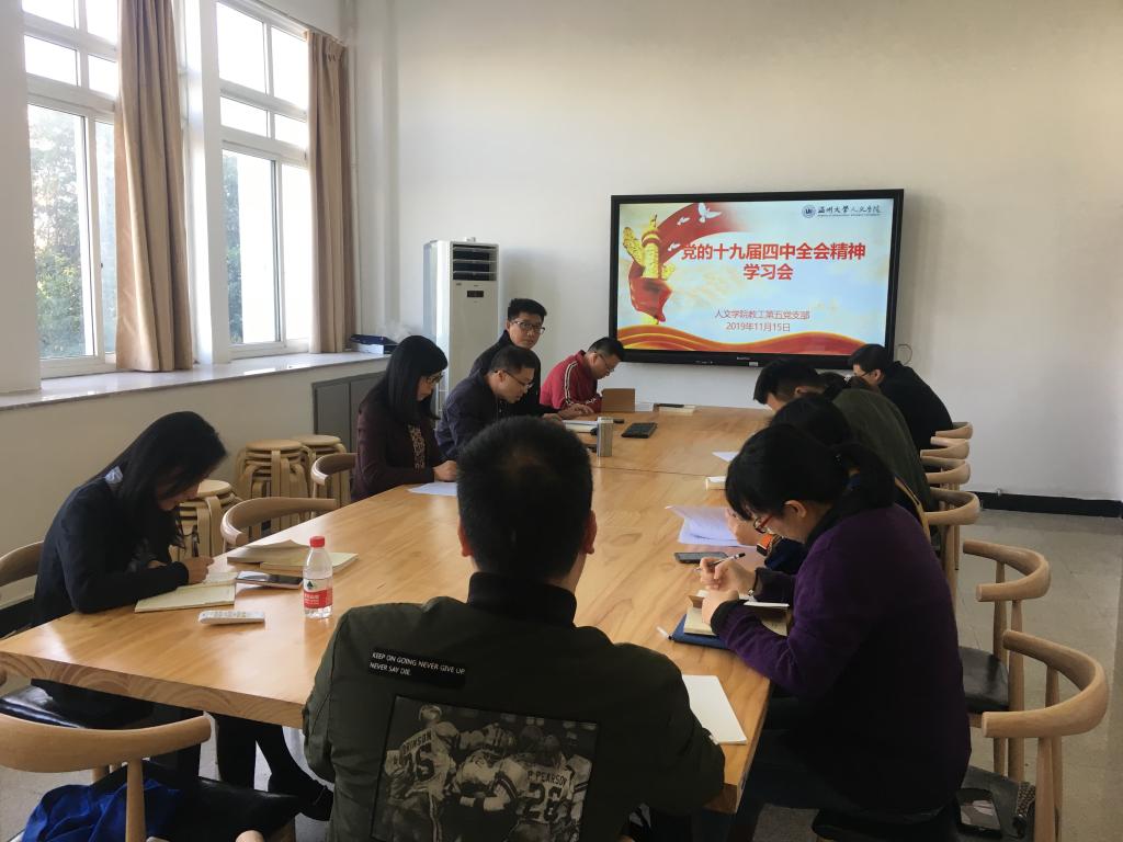 11月15日上午,樱花小说 教工第五党支部在北校人文楼214党员之家开展党的十九届四中全会精神学习会。活动由党支部书记魏一主持,支部全体成员参加。