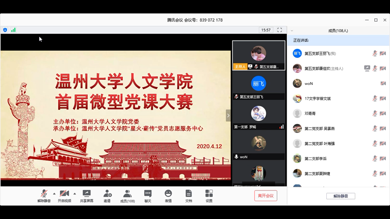 来自学生第四党支部的洪苗苗同志以“青山不老绿水长流,决胜小康奋斗有我”为主题,从安吉余村脱贫致富奔小康的故事出发,指出了习近平同志“绿水青山就是金山银山”的科学论断对安吉余村乃至浙江的发展做出的突出贡献。今年正是全面建成小康社会的收官之年,生态环境质量将直接影响全面小康的成色。如何构筑绿色发展的小康社会,可从安吉余村对“绿水青山就是金山银山”这一理念15载的践行中获得启示。来自学生第五党支部的王雅雅同学以“战疫情·显芳华·爱同在”为微型党课主题,为我们讲述了一个个浙江人战疫的故事。他们是赴武汉援助的英雄医疗团队,是在自己家乡加入抗疫队伍的大学生,是身在异国却心系祖国的爱国华侨们,他们都用自己的行动生动展现了什么是爱国精神、什么是温州精神。