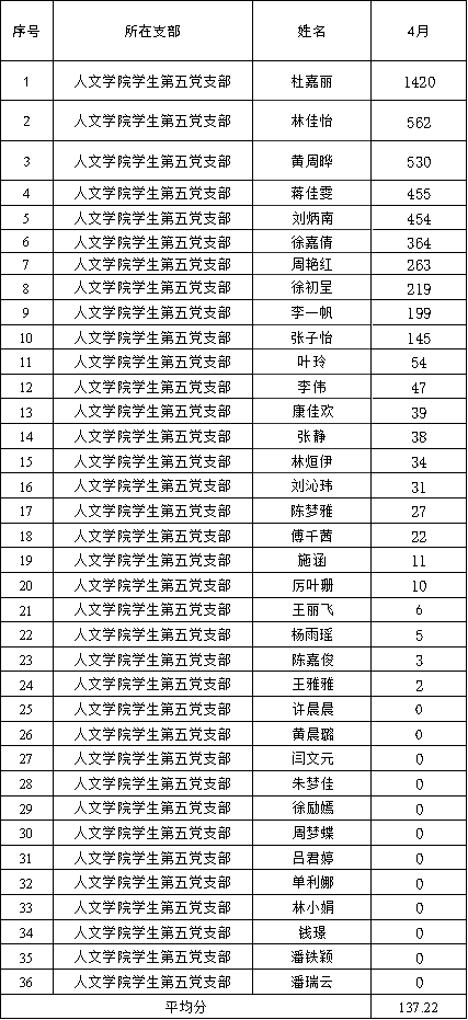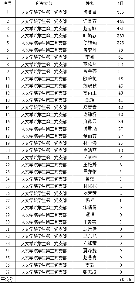 在4月份的学习中,总体上各个支部的学习情况呈现上升态势,自活动开展以来,已经慢慢培养起了良好的学习氛围。樱花小说 学生第四党支部以1303.89分(按平均分)成为月度优秀学习支部。