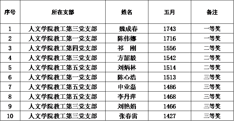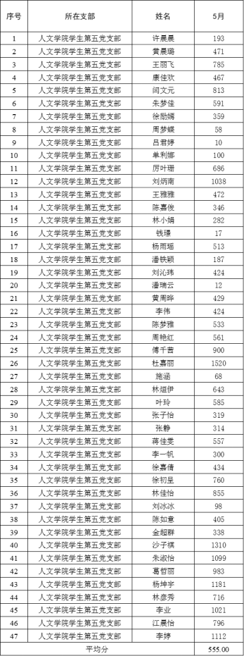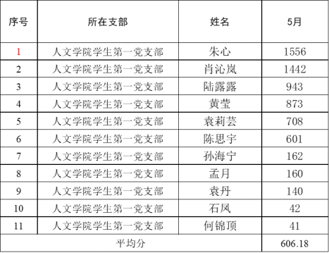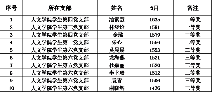 在5月份的学习中,总体上各个支部都能保持良好的学习情况,良好的学习氛围正在形成、固定。其中,樱花小说 学生第四党支部以1092.9分(按平均分)成为月度优秀学习支部。