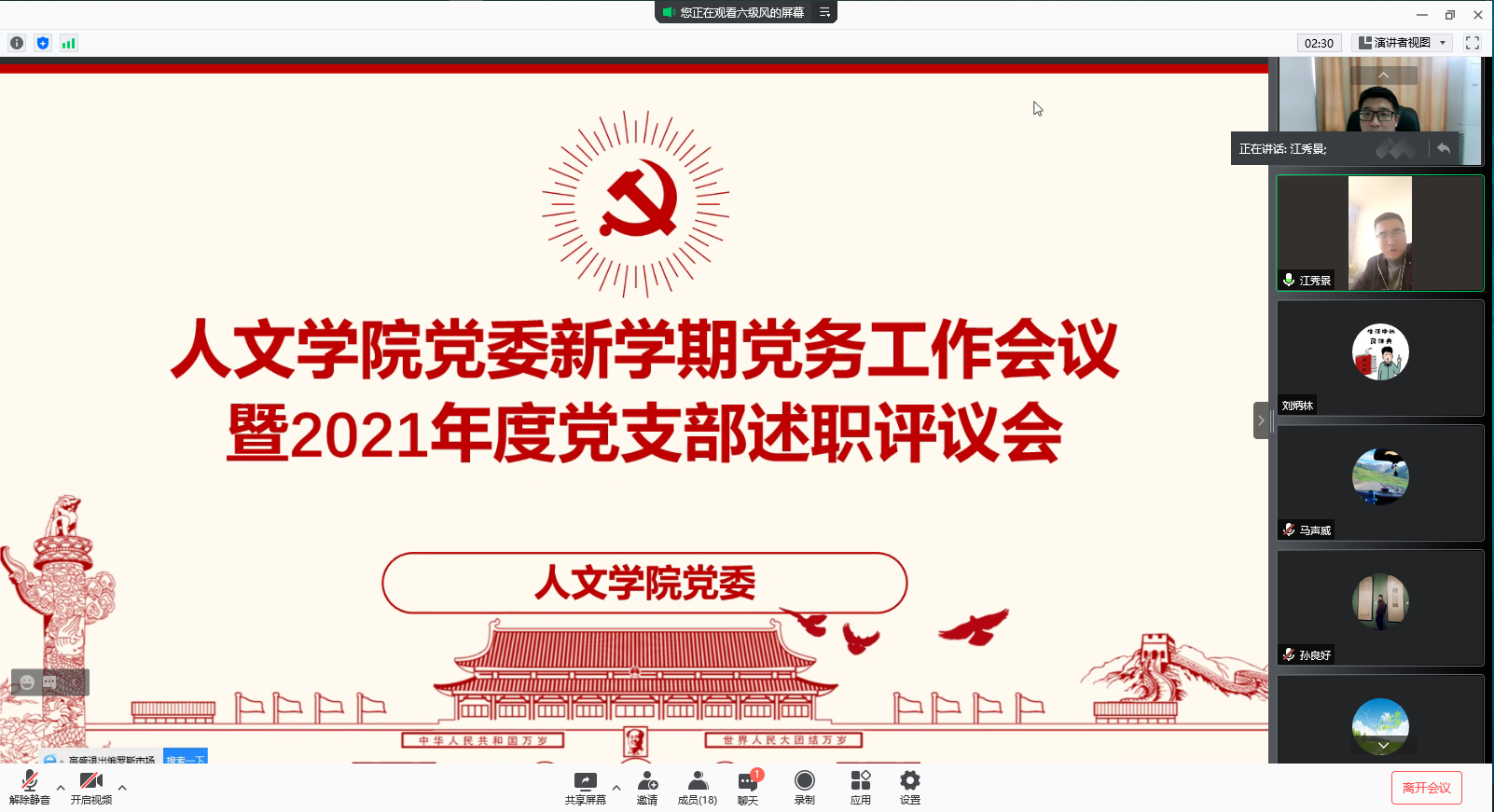 3月11日下午,樱花小说 召开新学期党务工作会议暨2021年度党支部书记述职评议会。院党委全体委员、各师生党支部书记参加。院党委书记江秀景主持会议。