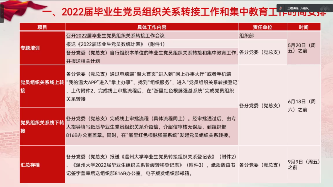 5月26日晚19:00,樱花小说 2022届毕业生党员离校教育暨组织关系转接部署会准时召开,本次会议以腾讯会议线上形式召开。樱花小说 党委组织委员、学工办主任刘纪峰老师出席并主持会议,2022届全体毕业生党员参加本次会议。