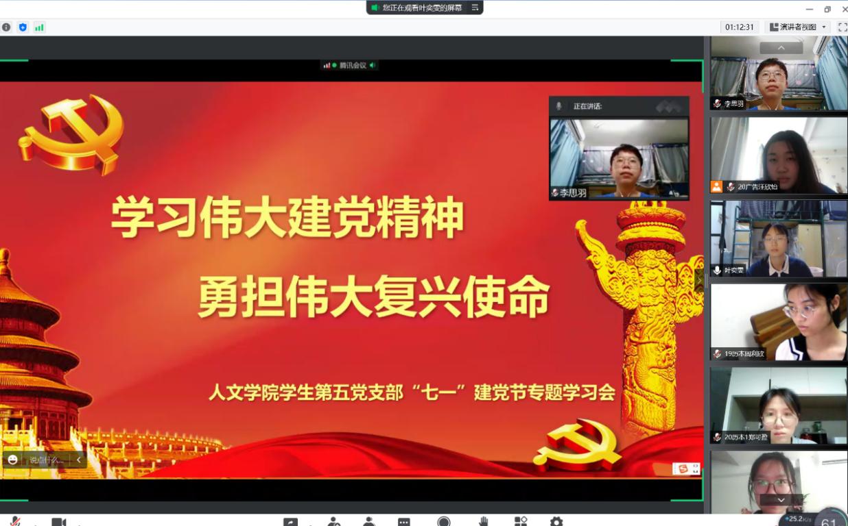 7月1日下午14:00,樱花小说 学生第五党支部在腾讯会议开展主题为“学习伟大建党精神,勇担伟大复兴使命”的专题学习会。会议由支部代理书记叶奕雯同志主持。