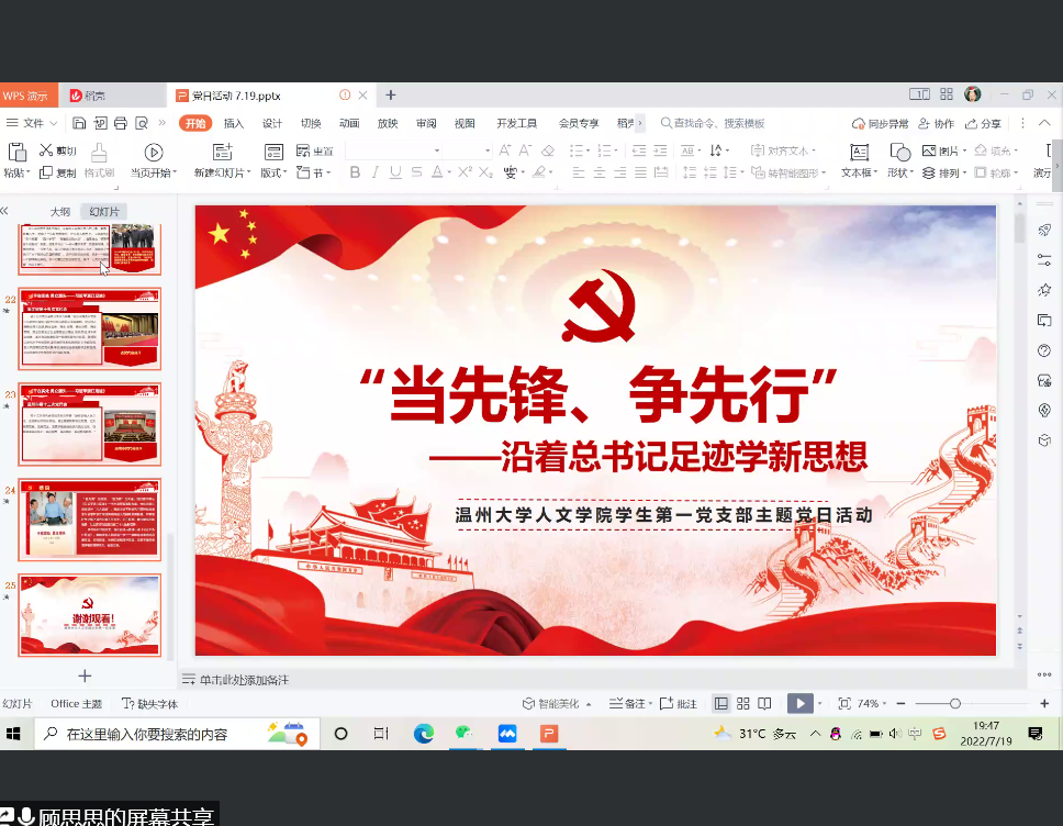 2022年7月19日,樱花小说 学生第一党支部依托在线会议平台,在线上召开了“当先锋、争先行”主题党日活动,深入学习《干在实处 勇立潮头——习近平浙江足迹》。本次党日活动由学生第一党支部书记黄莹主持。