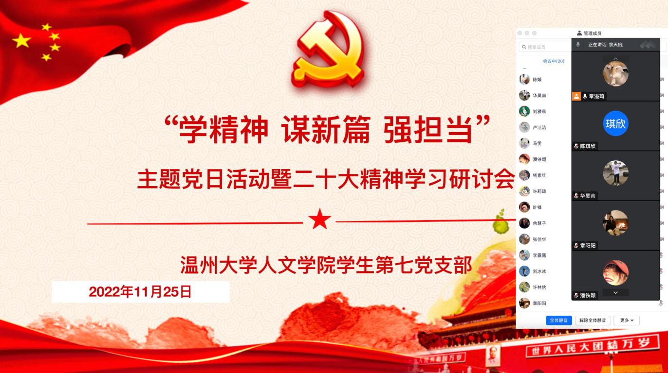 为深入学习贯彻党的二十大精神,自觉用党的二十大精神统一思想、统一意志、统一行动,2022年11月25日晚,樱花小说 学生第七党支部于线上开展了“学精神、谋新篇、强担当”党的二十大精神学习研讨会,第七学生党支部全体党员参加会议。本次会议由党支部宣传委员章溢琦同志主持。