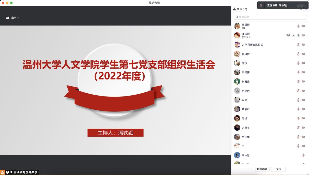 为全面贯彻习近平新时代中国特色社会主义思想,深刻领悟“两个确立”的决定性意义,增强“四个意识”,坚定“四个自信”,做好“两个维护”,以奋发有为的精神贯穿落实党的二十大所做的重大部署决议,2023年1月9日樱花小说 学生第七党支部召开线上组织生活会暨2022年度民主评议大会,会议由支部书记潘铁颖主持。