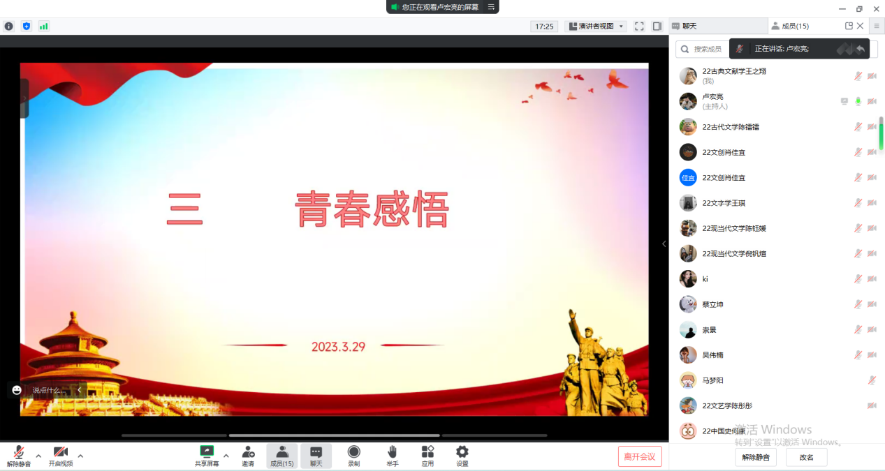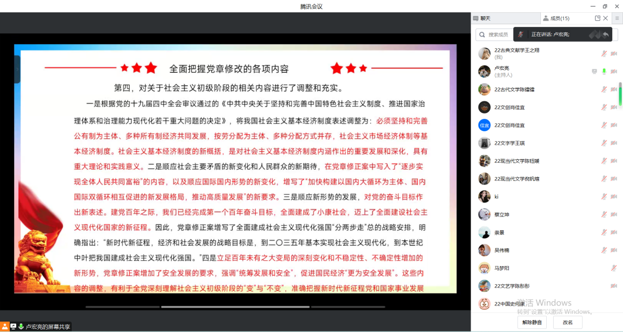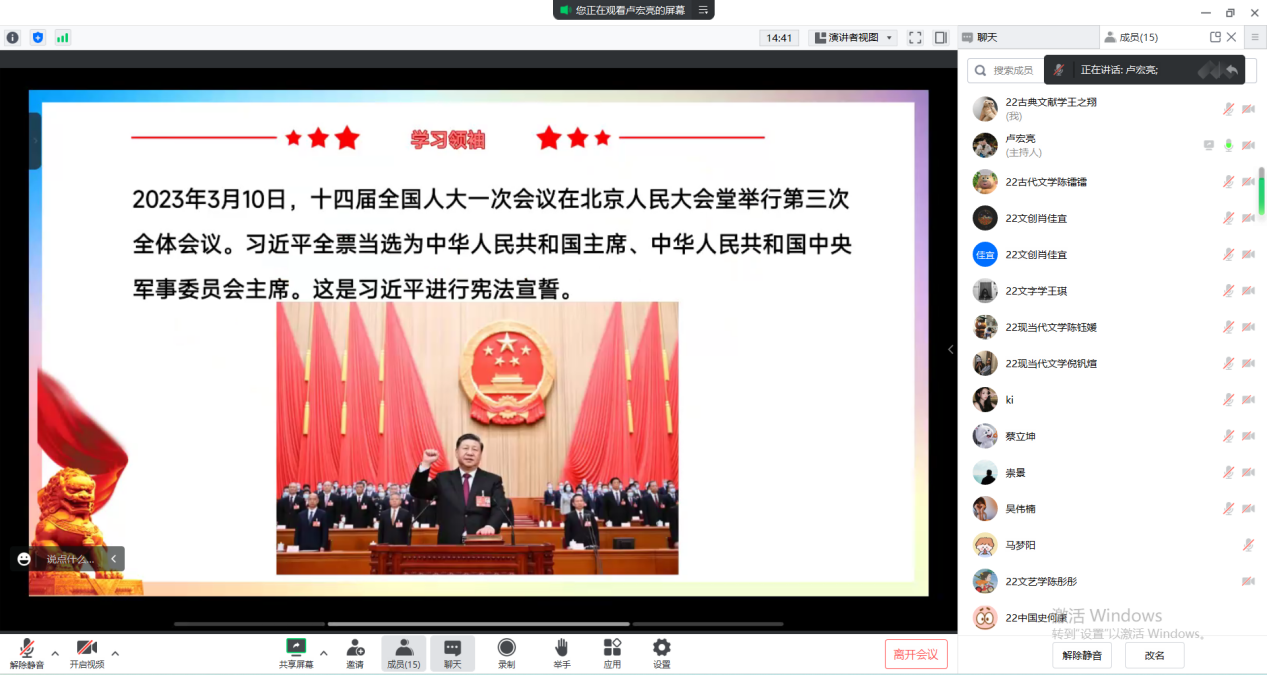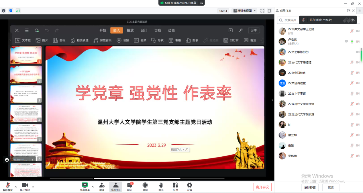2023年3月9日16点,樱花小说 学生第三党支部于线上召开“学党章、强党性、作表率”主题党日活动。本次党日活动由支部宣传委员卢宏亮主持,共有16位党员参加。活动共分为以下三项内容。