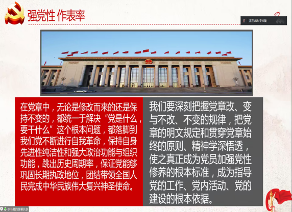 在心得分享环节,三位党员代表分享了自己的学习感悟。潘若颖同志结合自身情况,从党的理论制度创新、国家事业发展概况、党建新征程三个方面,分享了党的二十大对党章进行修改的理论与现实意义。李书凝同志从所学专业的角度,发表了对党章修改内容的见解,认为学生党员在不断提升自我修养和专业学识的同时,还要积极投身到教书育人中去,加强对中小学生“爱国主义”的教育。方雨婷同志重点分享了百年来党章的发展历程,强调学生党员要自觉学习党章,将新党章中的各项规定要求落实到行动上、体现在工作中,作为一名即将踏上社会的“新闻人”,应主动向身边的优秀党员学习,为建设新时代全媒体人才做出应有的贡献。