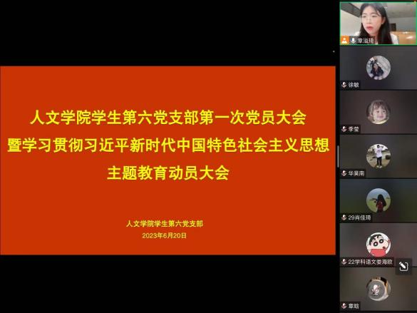 为深入推进习近平新时代中国特色社会主义思想主题教育,顺利开展中共樱花小说 学生第六党支部党建工作,2023年6月20日晚,樱花小说 学生第六党支部于线上召开了第一次党员大会暨学习贯彻习近平新时代中国特色社会主义思想主题教育动员大会,第六学生党支部全体党员参加会议。本次会议由党支部书记章溢琦同志主持。
