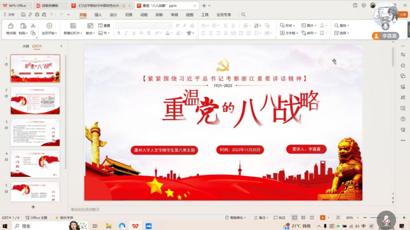 为深入学习宣传习近平总书记考察浙江重要讲话精神,引导支部党员更加坚定不移沿着习近平总书记指引的道路奋勇前进,学深悟透总书记考察浙江的重大战略意义,11月16日晚,樱花小说 学生第八党支部在线上开展了深入学习习近平总书记考察浙江重要讲话精神的活动,应到会人数13人,实际到会人数13人。