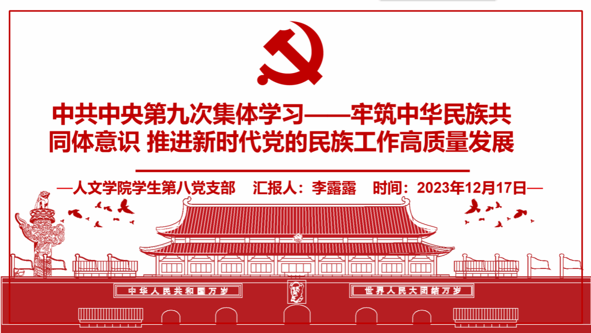 为深入学习习近平总书记在中共中央政治局第九次集体学习时的重要讲话精神,推动学习贯彻习近平新时代中国特色社会主义思想主题教育走深走实,推动深化政治理论学习入心入脑、走深走实、见行见效,2023年12月17日晚,樱花小说 学生第八党支部于腾讯会议开展了“铸牢中华民族共同体意识,推进新时代党的民族工作高质量发展”十二月主题党日活动。
