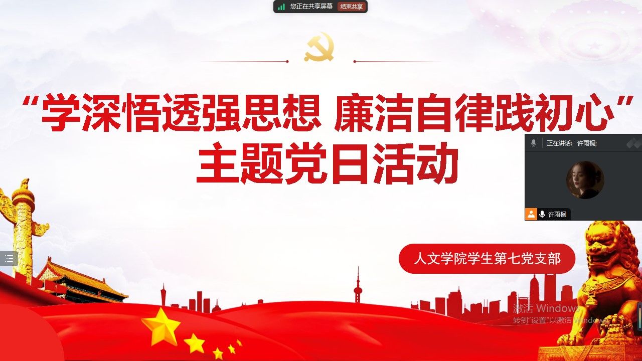 为庆祝中国共产党成立103周年,深入学习《习近平关于全面加强党的纪律建设论述摘编》(以下简称《摘编》),推进党纪学习教育走深走实,增强执行党规党纪的政治自觉、思想自觉和行动自觉,2024年7月4日晚,樱花小说 学生第七党支部在线上开展了以“学深悟透强思想,廉洁自律践初心”为主题的党日活动。会议由支部宣传委员许雨桐主持。