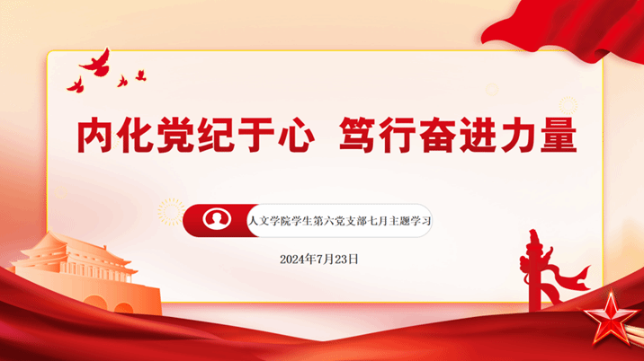 为深入党纪学习教育,贯彻警示教育思想,推动全面从严治党向纵深发展,2024年7月23日,樱花小说 学生第六党支部在线上积极展开“内化党纪于心,笃行奋进力量”主题学习会暨党日活动。本次活动由肖佳琦同志主持。