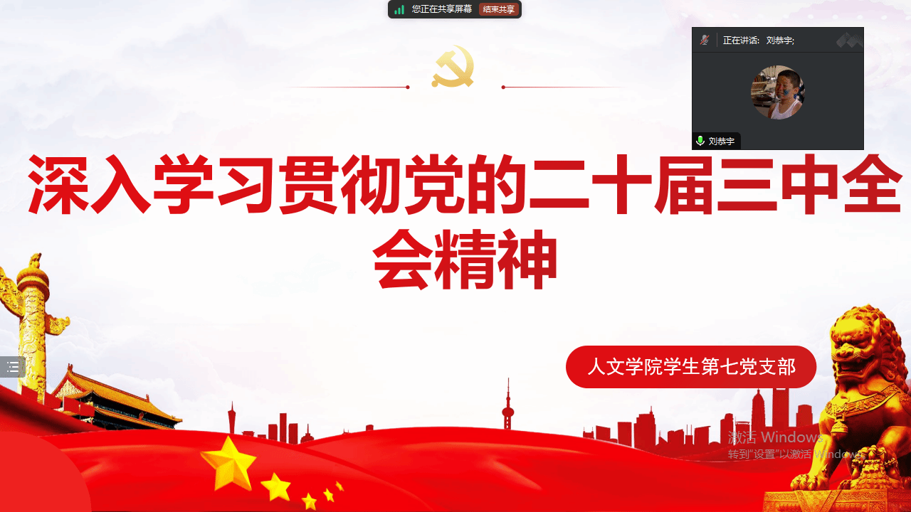 中国共产党第二十届中央委员会第三次全体会议(以下简称为党的二十届三中全会)于2024年7月15日至18日在北京召开。为深入学习贯彻此次全会精神,2024年8月6日晚,樱花小说 学生第七党支部在线上开展了以“深入学习贯彻党的二十届三中全会精神”为主题的党日活动。会议由党支部书记刘恭宇老师主持。