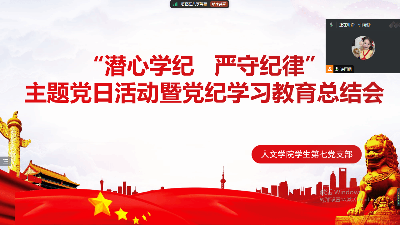 为深化“循迹溯源学思想促践行”行动,深入学习习近平总书记关于党纪学习教育的重要讲话和重要指示精神,推进党纪学习教育走深走实,取得实实在在的成效,2024年9月11日晚,樱花小说 学生第七党支部在线上开展了以“潜心学纪 严守纪律”为主题的党日活动。会议由支部宣传委员许雨桐主持。